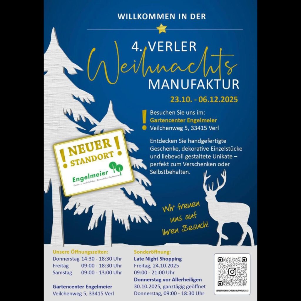 Markt Termine 4. Verler Weihnachtsmanufaktur November 28, 2025 / noch bis zum 6.12.2025 in der Gärtnerei Engelmeier in Verl